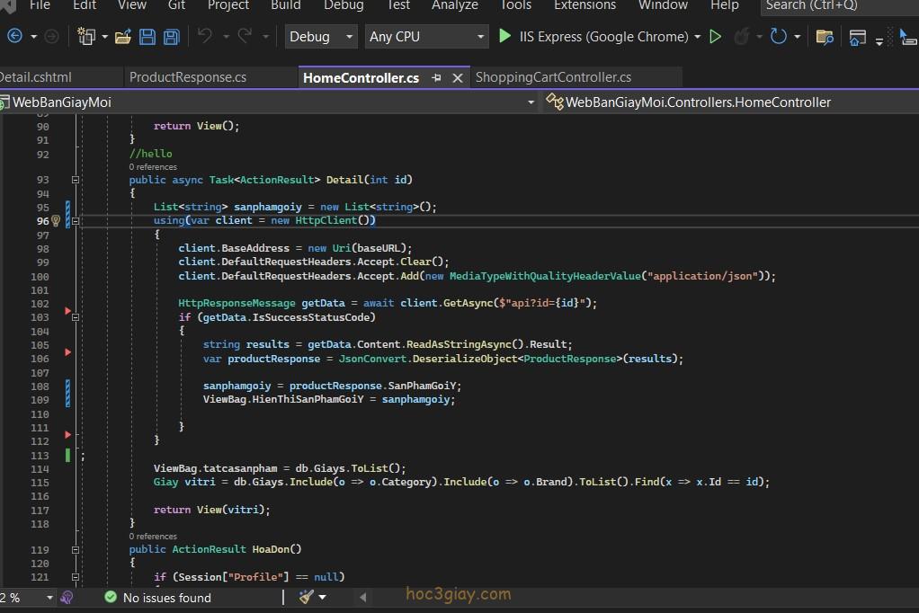Bước 3: Hiệu chỉnh thêm bên trong view của ActionResult là được, giờ bạn có thể đặt Debug để xem thử kết quả.
