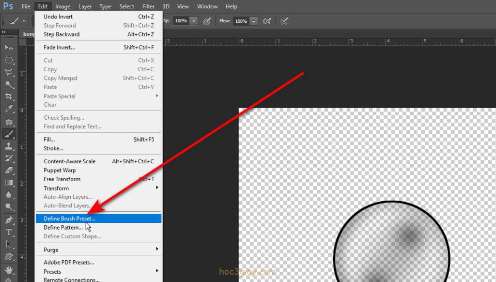 Bước 13: Bây giờ chúng ta sẽ chuyển tệp bóng bóng hiện tại thành một công cụ trong Tool Brush. Bạn click vào Edit trên thanh menu > chọn Define Brush Preset như hình dưới đây.