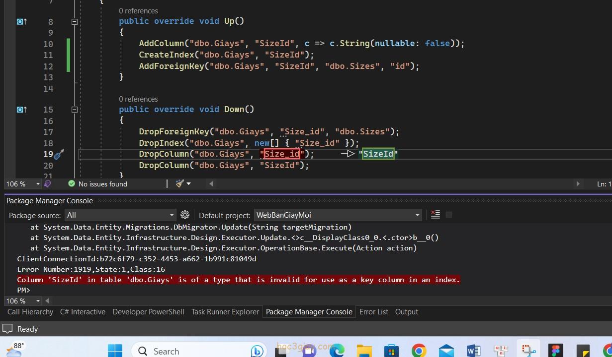 Khắc phục lỗi Column ‘x’ in table ‘dbo.x’ is of a type that is invalid for use as a key column in an index