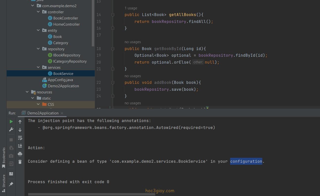 Khắc phục bằng cách thêm một annotation bên trên cái class đó. Ví dụ như mình thêm @Service trên class BookService.