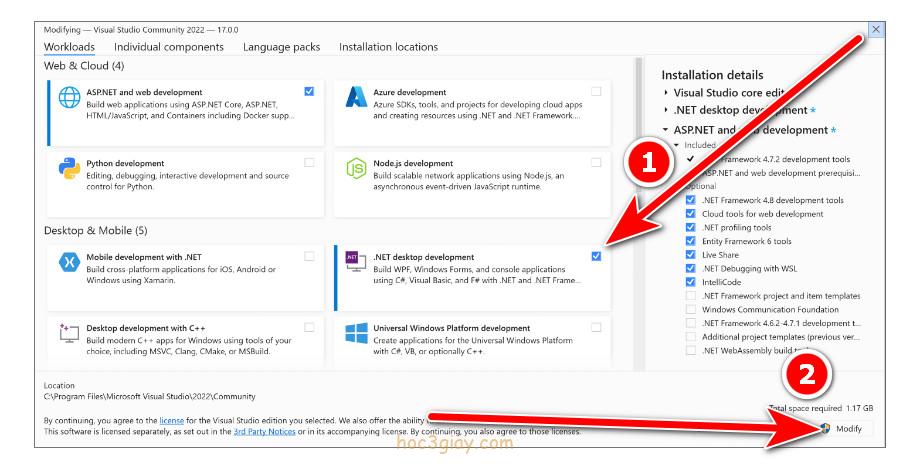 Ở đây bạn nào học Windows Forms thì chọn như hình mũi tên bên dưới là OK. Vì do khi cài một cái trong mấy cài này máy tính bạn sẽ chịu một lượng lớn dung lượng. Chính vì thế quá trì khi nhấn vào nút Modify sẽ cài lâu hay chậm tùy thuộc vào mạng nhà bạn mạnh hay yếu.