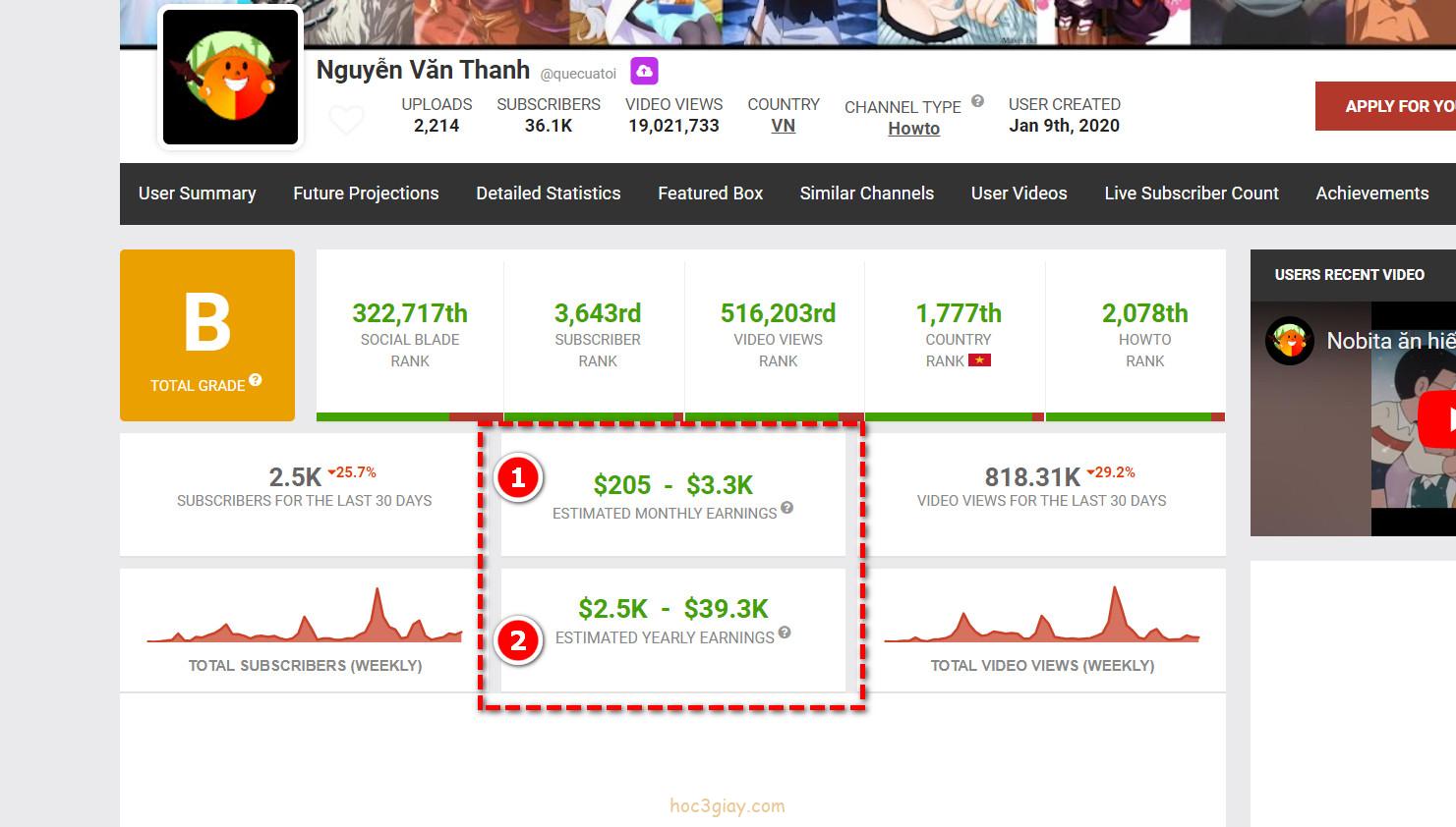 Thông qua nhưng thông tin mà trang SocialBlabe cung cấp. Có được các thông tin cần thiết để biết đại khái số tiền kiếm được cho một kênh youtube. Phải bạn cảm thấy trang này thú vị lắm không nào, nếu muốn biết nhiều thông tin hơn hãy truy cập vào website hoc3giay.com hàng tuần để được nhận nhưng thông tin mới nhất.