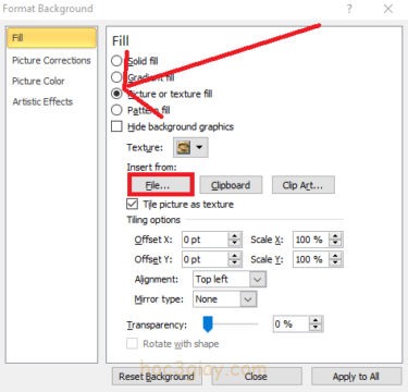 Bước 3: Tại hộp thoại Form Background, bạn tích vào ô Picture or texture fill. Sau đó nhần vào nút file để lấy ảnh.
