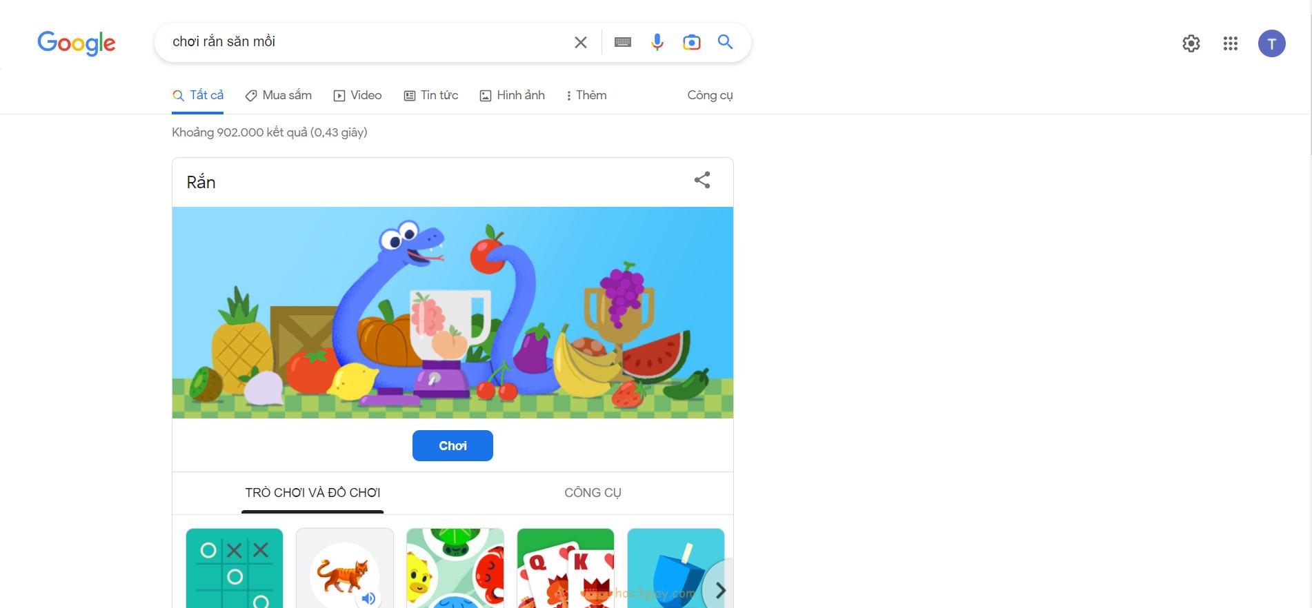 Bước 1: Bạn lên google tìm kiếm từ khóa “Chơi rắn săn mồi”, nó sẽ hiện ra cho chúng ta trò chơi trên top đầu tiên kết quả tìm kiếm như dưới.