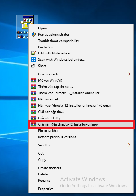 Bước 2: Bạn giải nén nó ra bằng cách dùng phần mềm có tên là winrar, ở đây mình sẽ không nói cách tải nhé vì nó khá là đơn giản và bạn có thể làm được nhanh chóng. Khi bạn đã có phần mềm winrar rồi đó, thì các bạn click chuột phải vào ứng dụng mới tải về và chọn phần Giải nén đến directx-12_installer-online\ như hình sau: