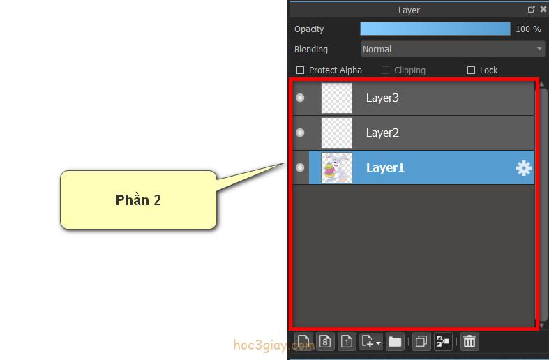 4 nút từ bên trái qua ở hình trên là các nút để tạo layer mới. Bình thường khi cần vẽ thì bạn dùng nút đầu tiên là được. Sau khi layer mới được tạo thì nó sẽ xuất hiện lên trên vùng chứa layer ở phần 2 hồi nãy.